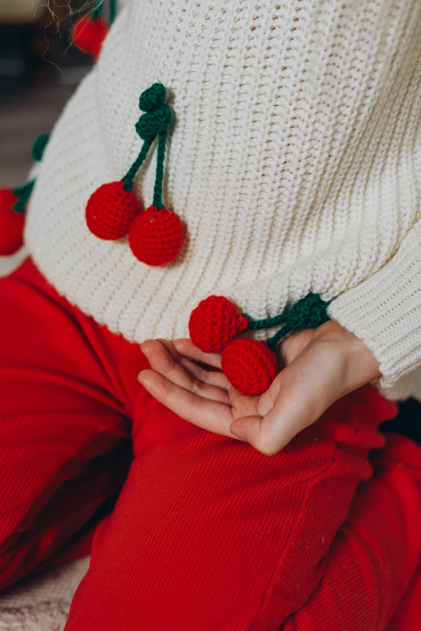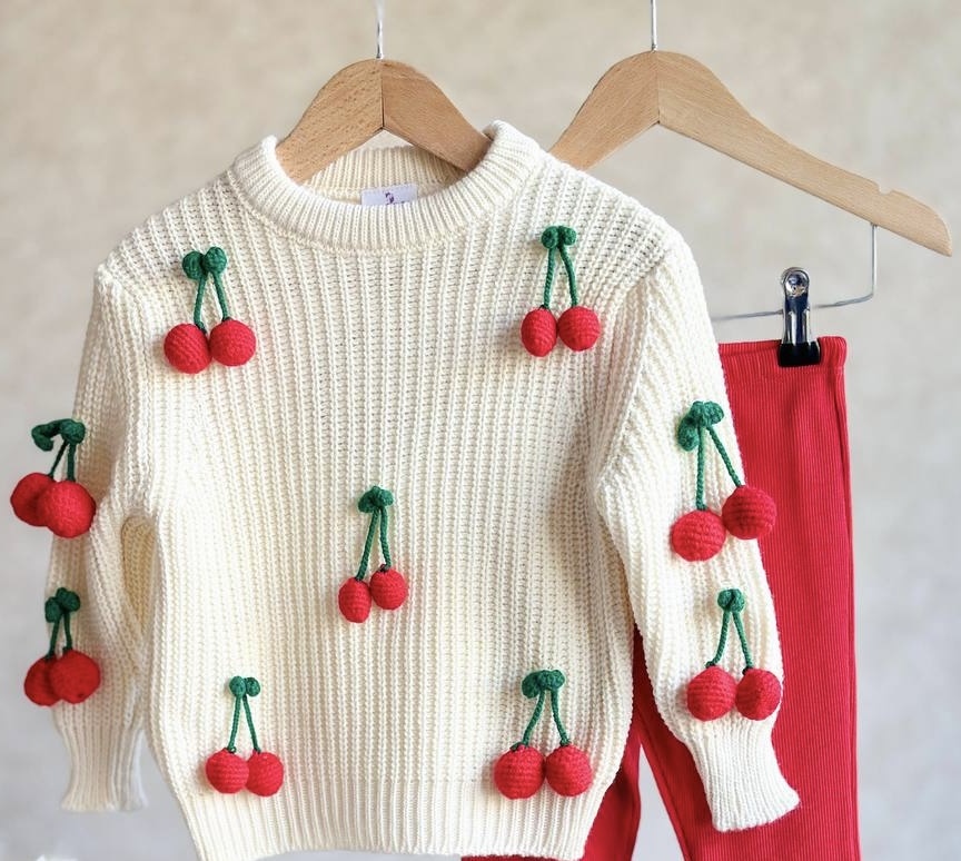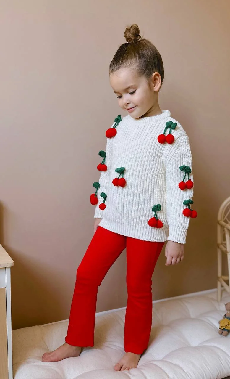 Þetta er bara ást. Þetta er mjög töff beige peysa skreytt með þrívíddar kirsuberjum og rauðum bómullarleggings sem víkka út neðst. Þetta er metsöluvara okkar. Allir skreytingarþættir eru þétt og vandlega saumaðir við peysuna.