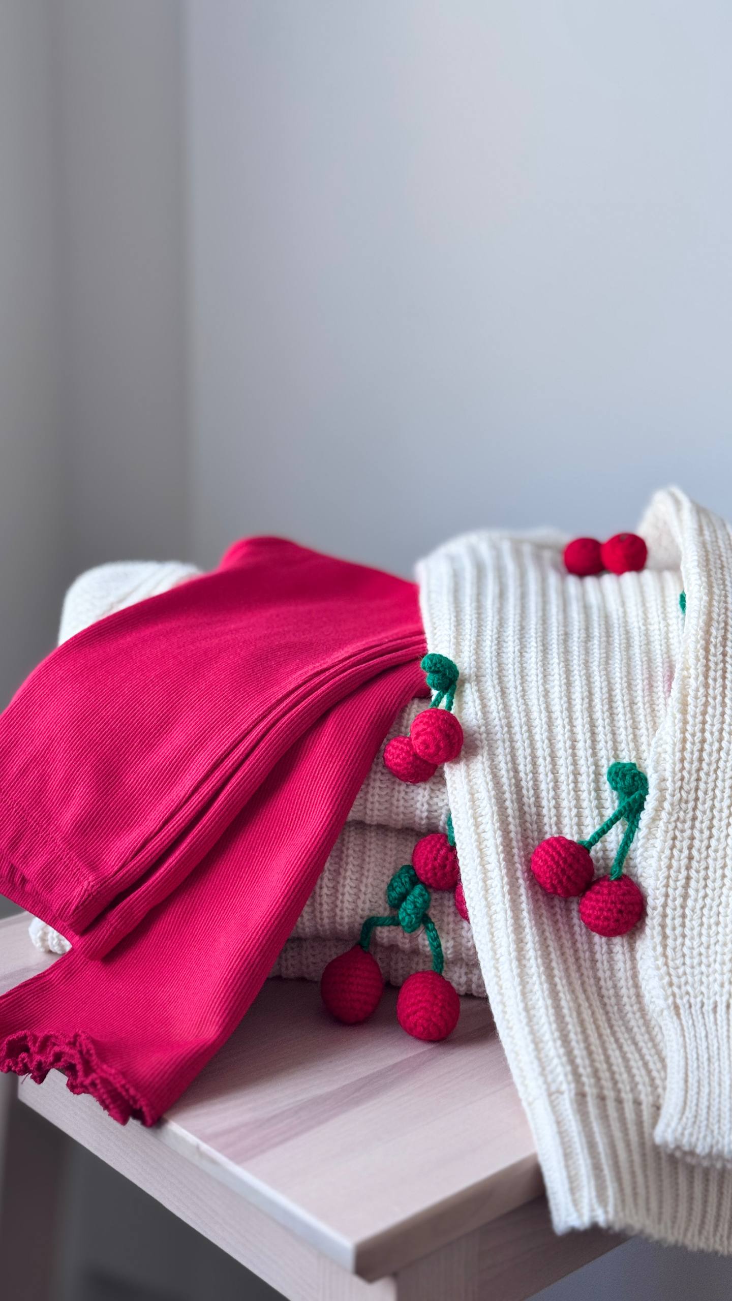Beige peysa með fallegum kirsuberjaskrautum og rauðar bómullarleggings sem víkka út neðan.
