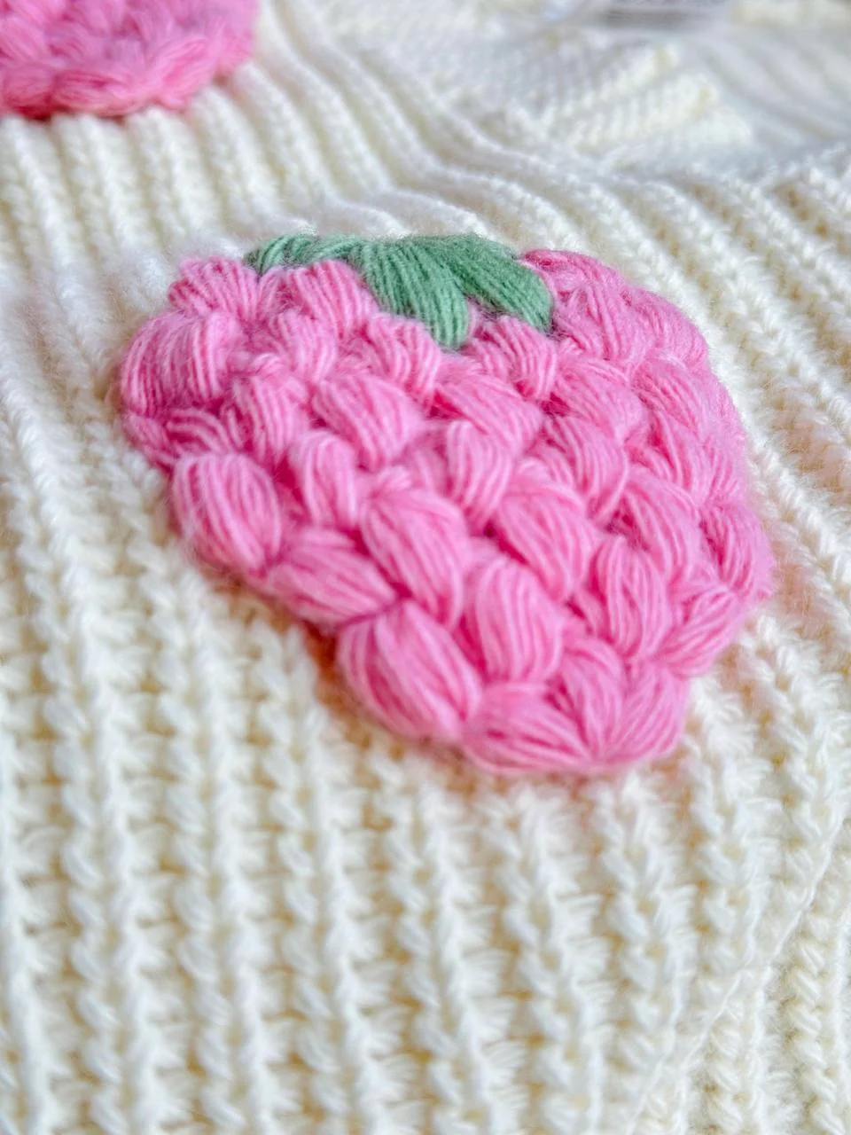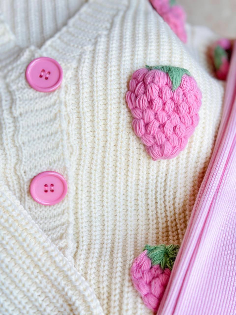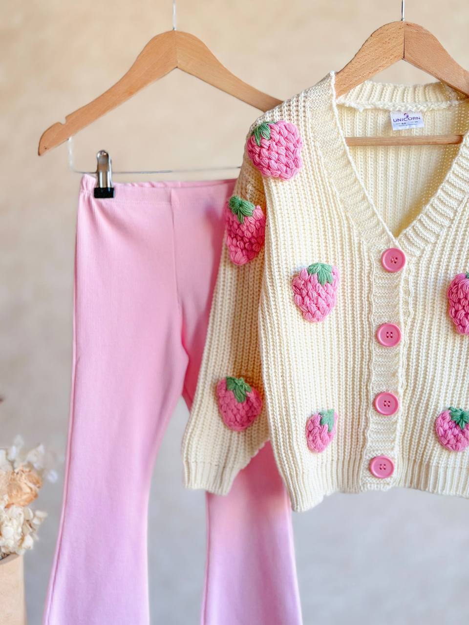Þetta er bara ást. Þetta er súpertíska beige peysa með stórum hindberja skrautum og bleikar bómullarleggingar, víðar neðst. Þetta er bara vá.