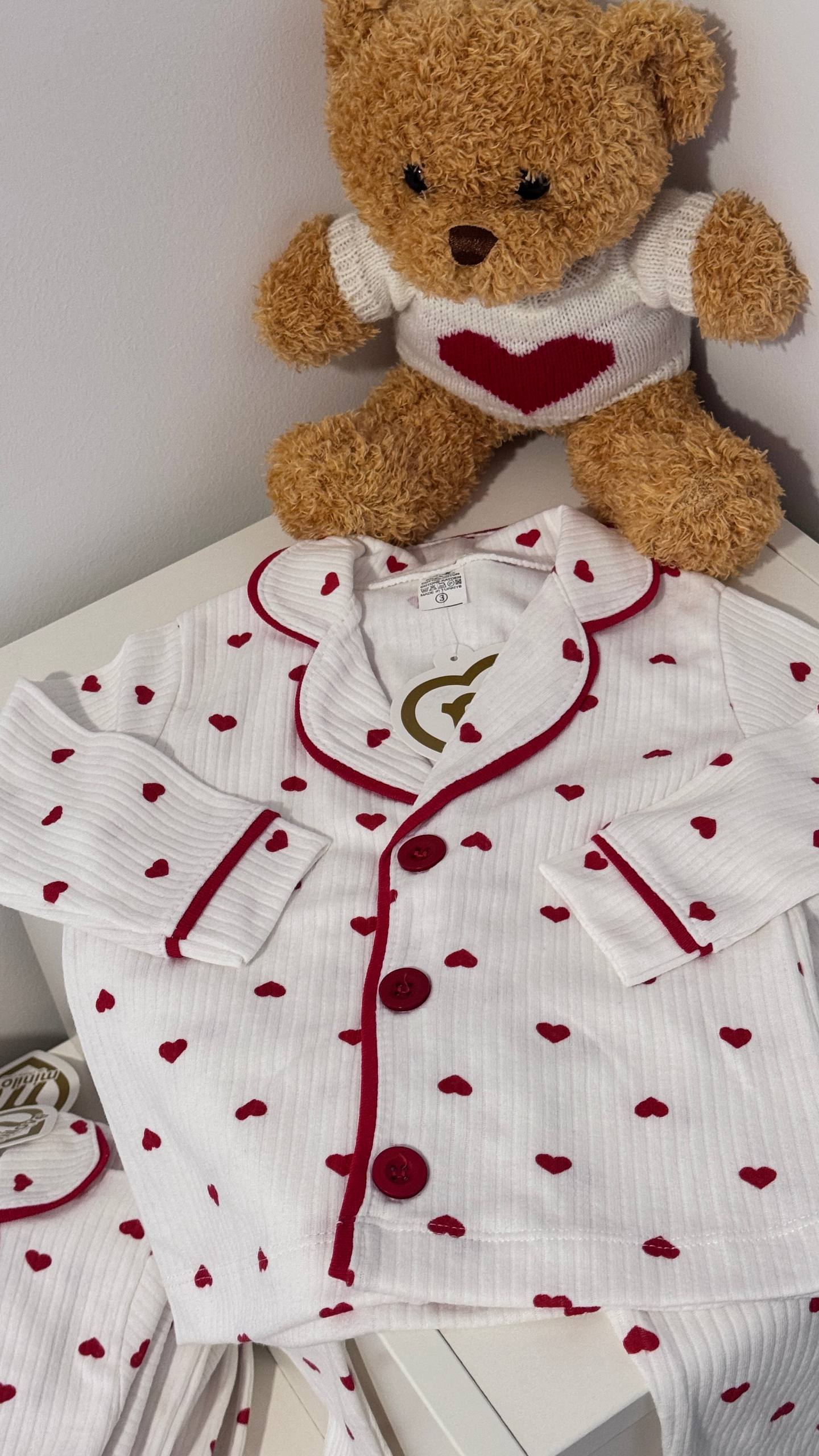 Mjúk riffluð bómullarnáttföt með hjartamynstri og hnöppum.