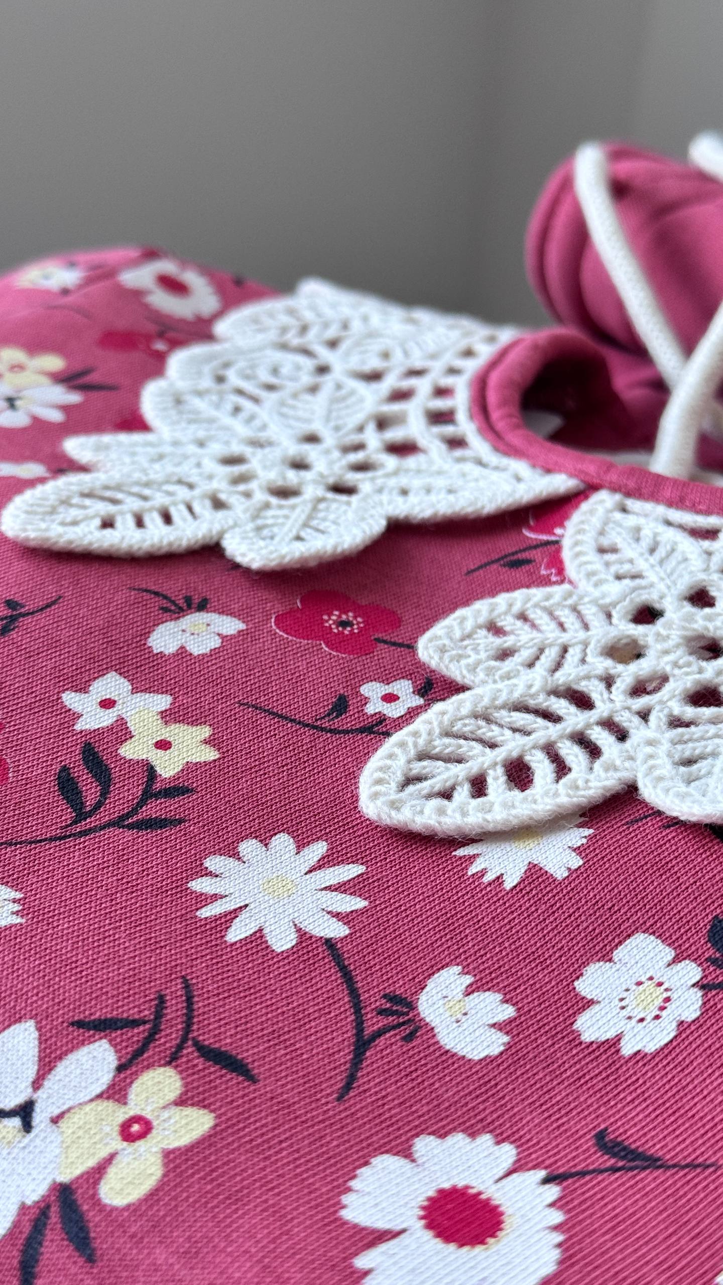 Peysa með blúndukraga og blómaprentun að framan.