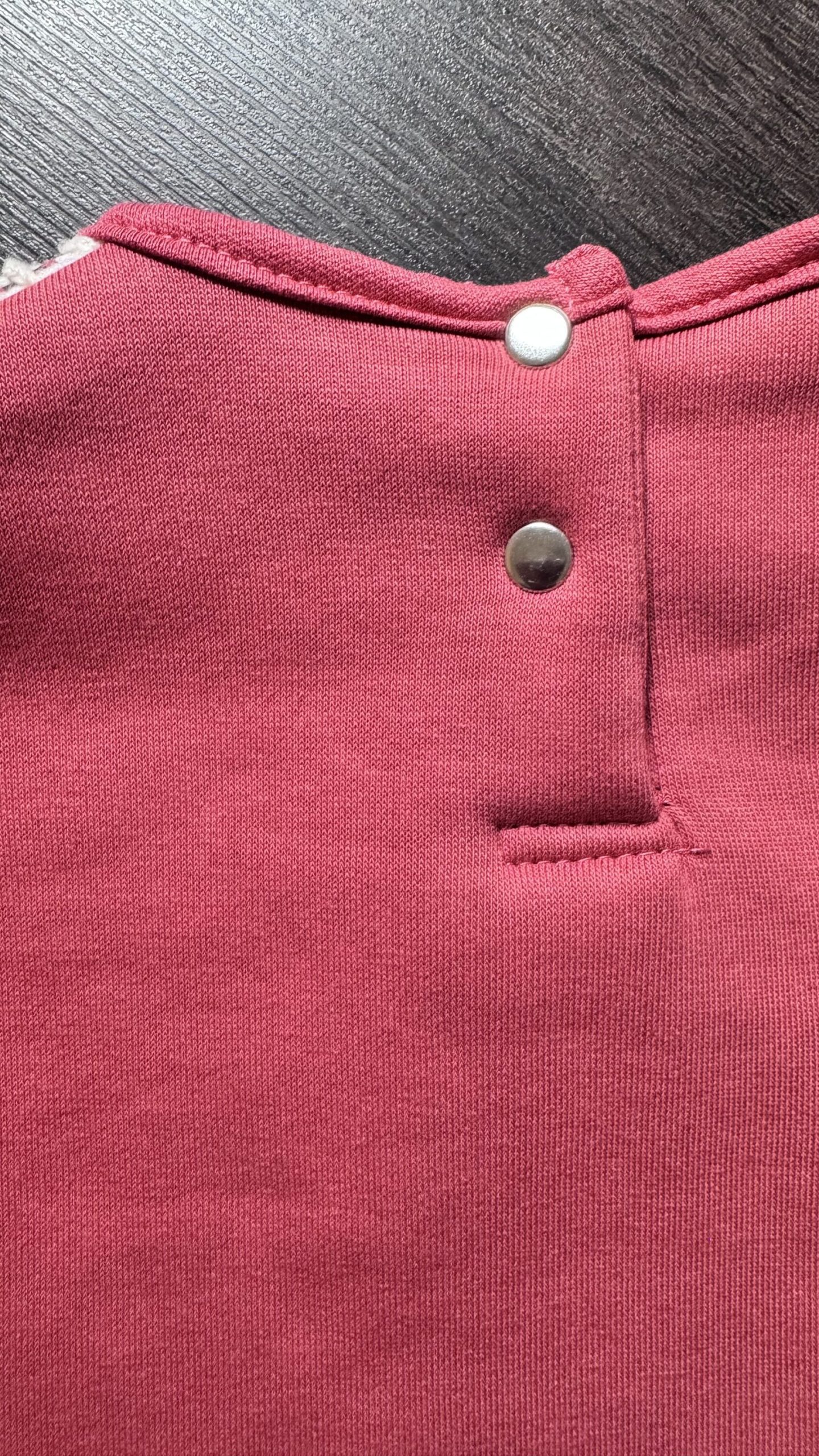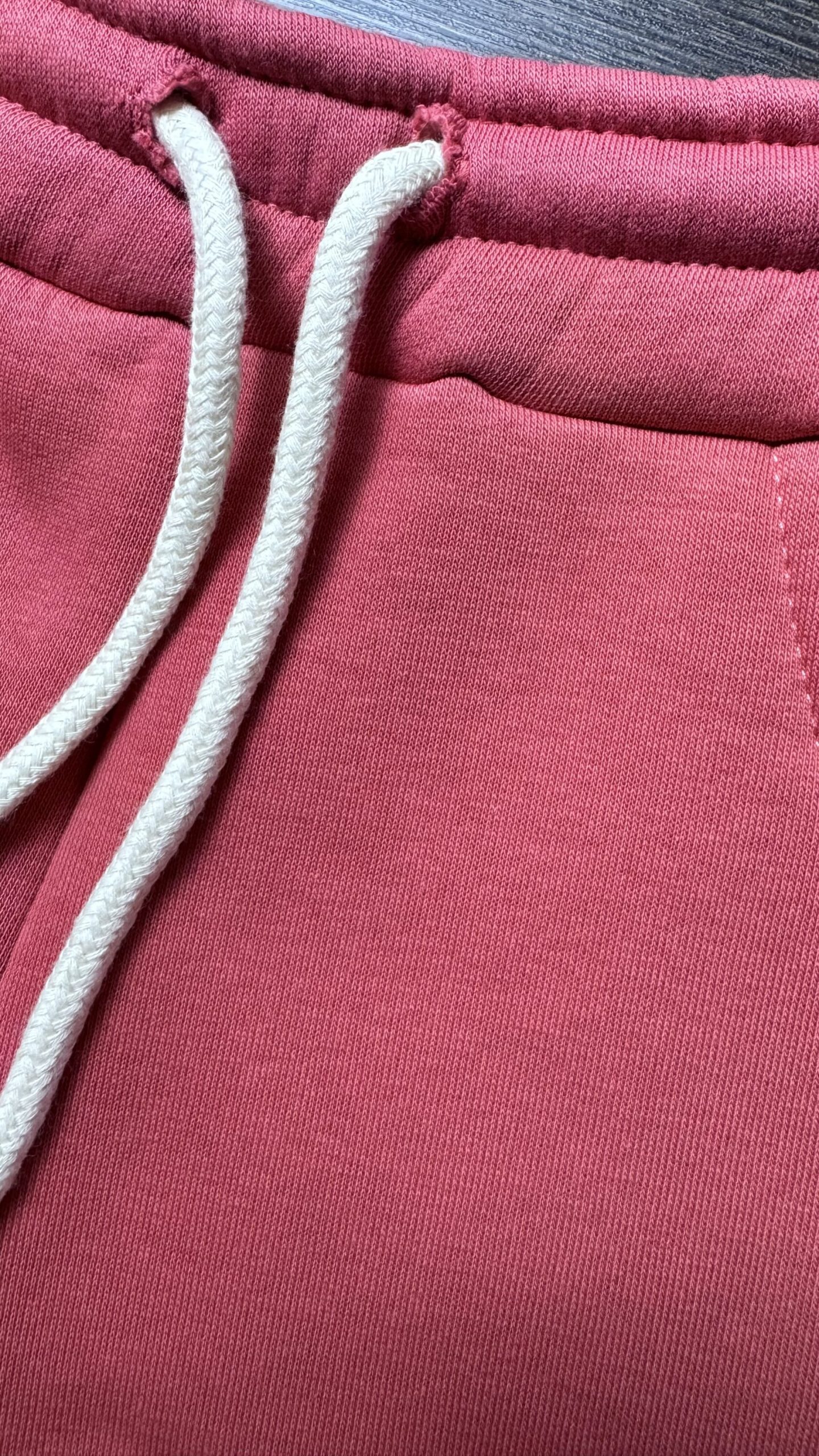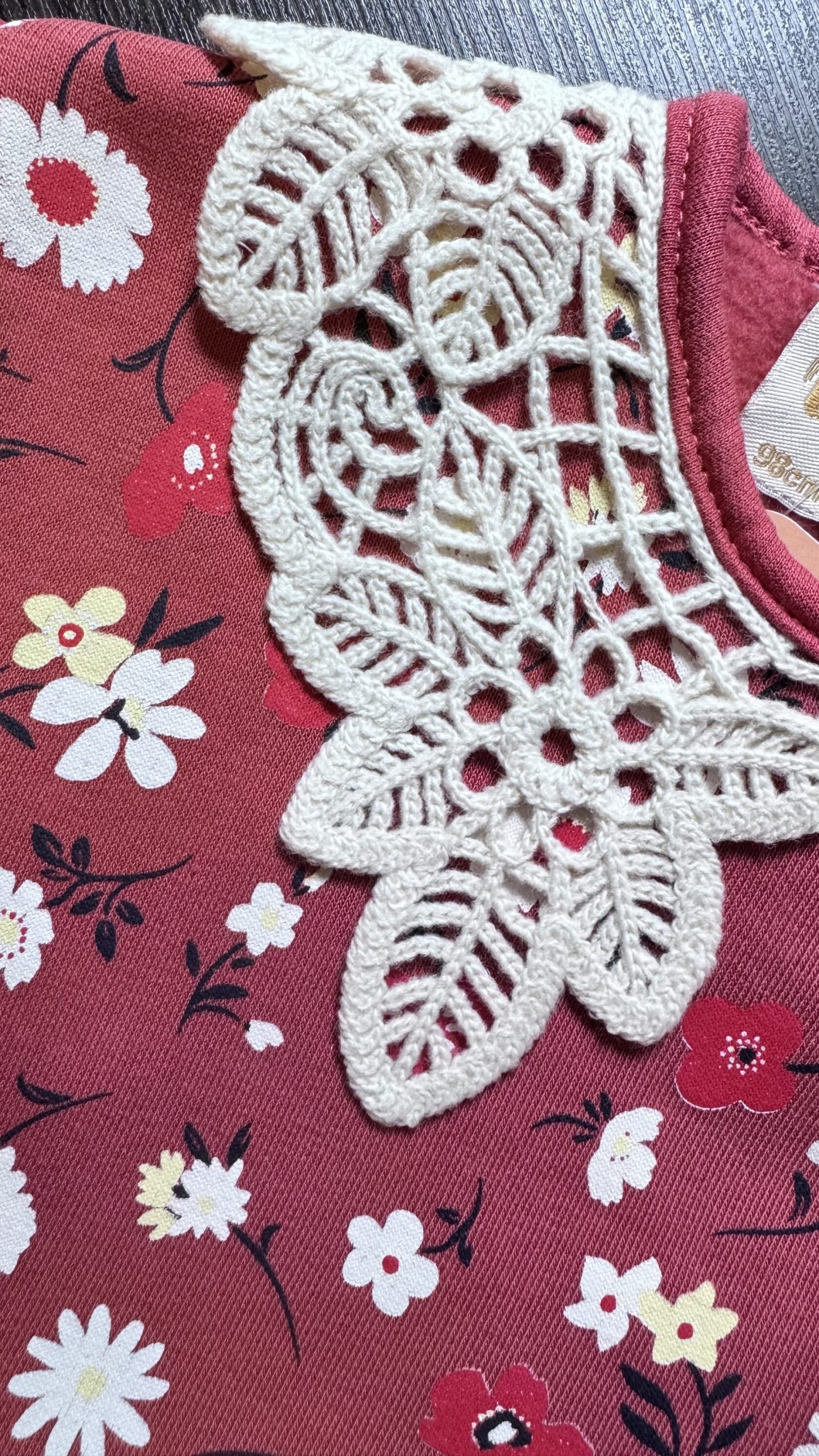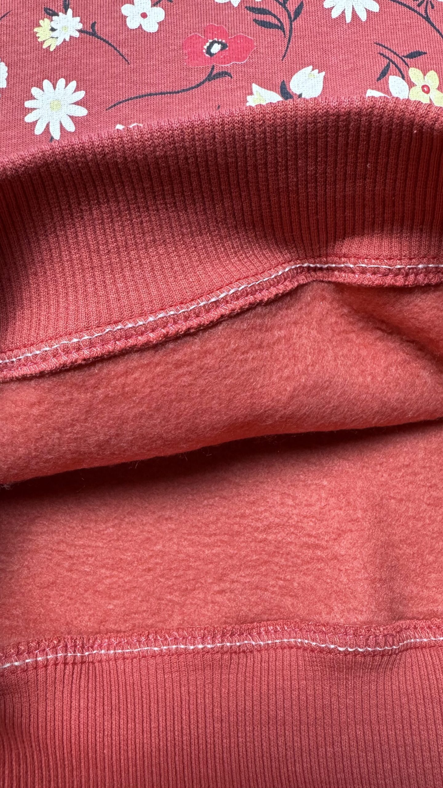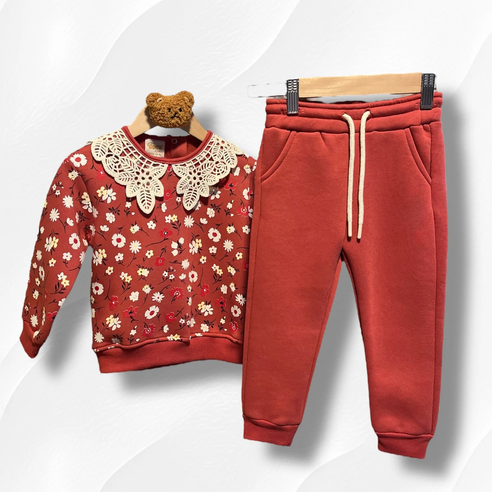 Peysa með blúndukraga og blómaprentun að framan, mjókkar buxur með teygju í mitti og snúru og teygju að neðan. Settið er einangrað með þunnu flísefni.